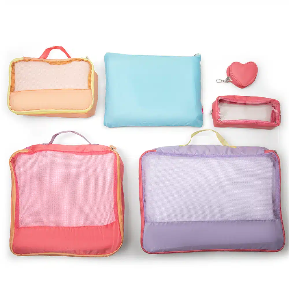 Bring some color and organization to your packing routine! You’ll have the contents of your suitcase in tip-top shape with this assortment of packing cubes, cosmetic bag and pouch in bright, fun hues. Top off your bag with the cute heart charm, too!