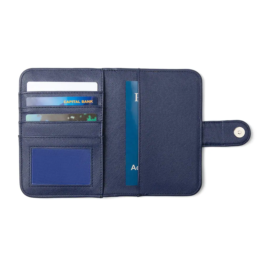 Sail off into the sunset with the Miamica navy passport case from our Coastal Charm collection! Keep a firm grasp on your passport and other travel documents in this slim, secure travel accessory. This passport case doubles as a travel wallet with plenty of slots for your credit cards and ID.